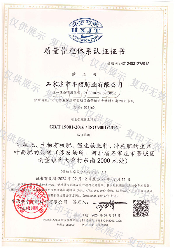 石家莊市豐碩肥業(yè)有限公司是一家集新型肥料的研發(fā)、制造、營銷、服務于一體的高新技術企業(yè),公司自2008年創(chuàng)辦以來,一直致力于新型肥料的技術研發(fā)和市場推廣。公司組建了豐碩新型肥料研究中心(院士專家企業(yè)工作站),自主知識產權研發(fā)團隊專業(yè)科研人員20余人,獲得了多項肥料國家發(fā)明專利。公司目前已擁有發(fā)酵類有機肥、微生物菌劑、生物有機肥、土壤調理劑、大量元素水溶肥、含腐植酸肥料、含氨基酸肥料、中微量元素肥料等8大品類,“金維克”、“豐碩沃農”等2大自有品牌,擁有20多個暢銷品種。目前,我公司已經通過了“ISO9001 質量管理體系認證”、“ISO14001 環(huán)境管理體系認證”、“OHSAS18001 職業(yè)健康管理體系認證”。...